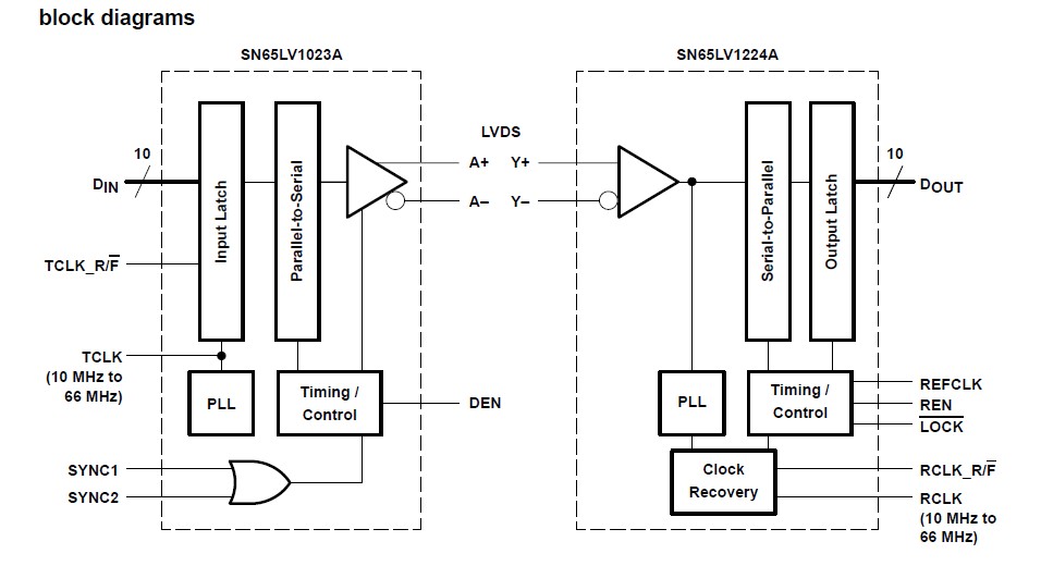 The SN65LV1023ADB is a 10-bit serializer/deserializer chipset designed to transmit data over differential backplanes or unshielded twisted pair (UTP) at clock speeds from 10 MHz to 66 MHz. The chipset of the SN65LV1023ADB has five states of operation: initialization mode, synchronization mode, data transmission mode, power-down mode, and high-impedance mode.